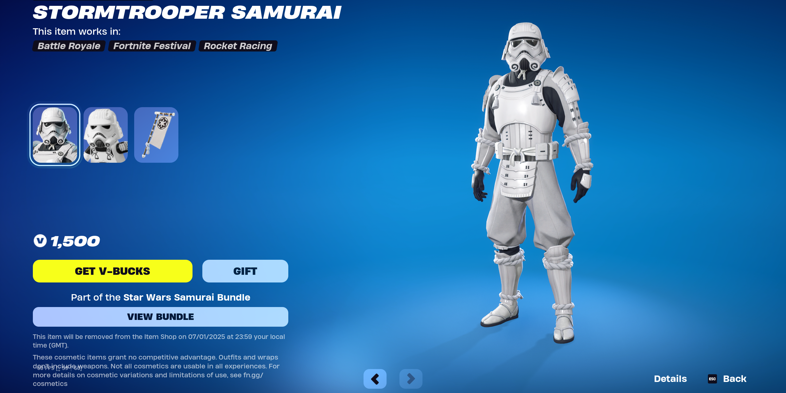 Le fidèle fantassin de l'Empire Galactique, le Stormtrooper rejoint Dark Vador comme skin achetable pour 1 500 V-Bucks. Bien qu'il ne s'agisse pas d'un Seigneur Sith, le Stormtrooper Samurai se démarque néanmoins comme une variante unique de l'ennemi classique Star Wars. Bien qu'il lui manque la Force, le Stormtrooper Samurai est livré avec quelques cadeaux, comme le Imperial Banner Back Bling pour élever le sceau de l'Empire au nom de Palaptine, et une variante LEGO pour les modes LEGO.