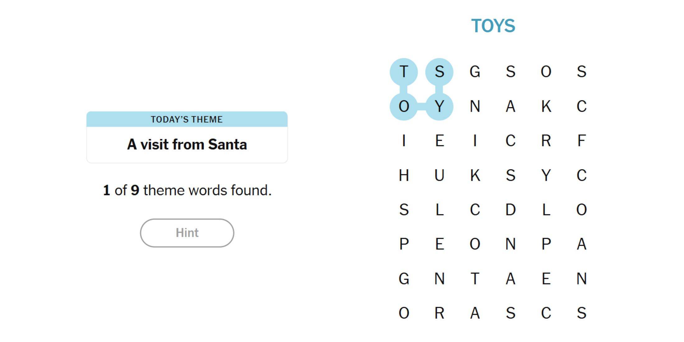 今天的《Strands》谜题线索是圣诞老人的来访。有九个东西需要找到,包括Pangram和八个主题词。